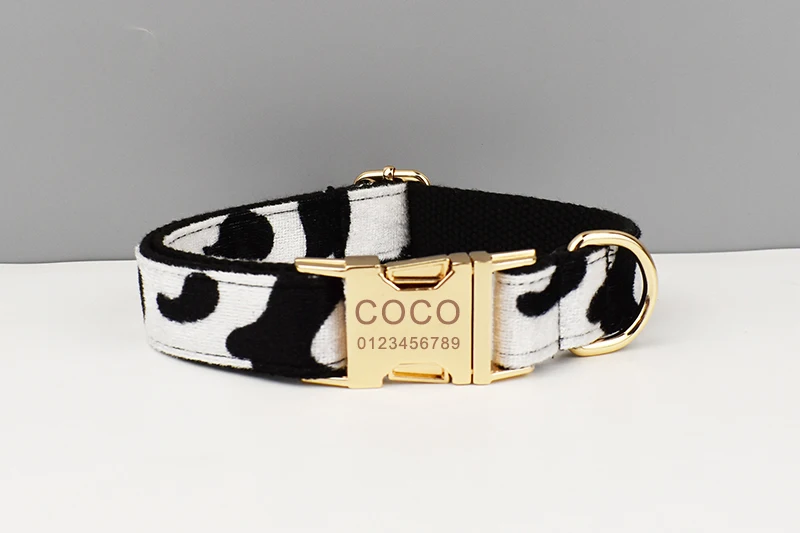 Juego de collar táctico de lujo personalizado para perros, con estampado de vaca, arnés y correa para mascotasAviso importante:Sobre el grabado: Podemos grabar el nombre del perro, número de teléfono u otros logotipos personalizados.